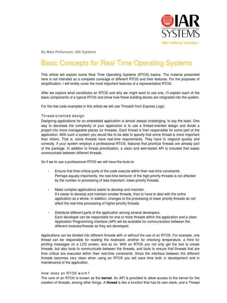 This article will explain some Real Time Operating Systems (RTOS) basics. The material presented here is not intended as a complete coverage of different RTOS and their features. For the purposes of simplification, I will briefly cover the most important features of a representative RTOS. After we explore what constitutes an RTOS and why we might want to use one, Ill explain each of the basic components of a typical RTOS and show how these building blocks are integrated into the system. For the few code examples in this article we will use ThreadX from Express Logic. Thread-oriented design Designing applications for an embedded application is almost always challenging, to say the least. One way to decrease the complexity of your application is to use a thread-oriented design and divide a project into more manageable pieces (or threads). Each thread is then responsible for some part of the application. With such a system you would like to be able to specify that some thread is more important than others. That is, some threads have real-time requirements. They have to respond quickly and correctly. If your system employs a professional RTOS, features that prioritize threads are already part of the package. In addition to thread prioritization, a clean and well-tested API is included that eases communicate between different threads. So if we to use a professional RTOS we will have the tools to: Ensure that time-critical parts of the code execute within their real-time constraints. Perhaps equally importantly, the real-time behavior of the high-priority threads is not affected by the number or processing of less important, lower-priority threads. Make complex applications easier to develop and maintain. Its easier to develop and maintain smaller threads, than to have to deal with the entire application as a whole. In addition, changes to the processing of lower priority threads do not affect the real-time processing of higher-priority threads. Distribute different parts of the application among several developers. Each developer can be responsible for one or more threads within the application and a clean Application Programming Interface (API) will be available for communication between the different modules/threads as they are developed.