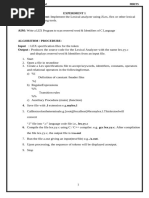 1. Write a lex Program to identify a simple and a compound statement. %{ #include<stdio.h> int F0=0,F1=0,F2=0,error=0,l1=0,l2=0; %} verb am|run|sit|did|study|is|large|go|come subject [a-zA-Z]+ compnd and|but|also|either|neither|yet|still|consequences %% {verb} { if(F2==1) l2=1; F2=1; if(F1==0) error=1; } {compnd} { F0=1; } {subject} { if(F1!=0) l1=1; F1++; } %%
