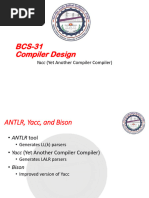 Introduction to the lab procedures and evaluation scheme, Lex and YACC specifications. Write a lex Program to identify a simple and a compound statement. Write a lex Program to count the number of keywords and identifiers in a sentence. Write a lex program to convert an octal number to decimal number. Write a YACC Program to check whether given string a^nb^n is accepted by the grammar. Write a YACC program to check the validity of an arithmetic expression. Write a YACC Program to identify an input for the grammar a^nb (n>=10). Instruction class on ANTLR (Another tool for Language Recognition). Write an ANTLr grammar to accept the pascal statement READ(Value) and print a parse tree for the same. Write an ANTLr grammar to perform basic arithmetic operation in a calculator Write an ANTLr grammar to accept a block of PASCAL statements between begin and end and print the parse tree for the same. Write an ANTLr grammar to decide whether given sentence is simple or compound.