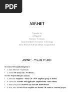 ASP.NET CONTROLS AND ASP.NET WEB FORMS: Normally webapp user interface for both i/p and o/p are designed using html forms and html controls. For an Asp.Net developer asp.net provides asp.net web forms and controls. Some of the important reasons to use Asp.Net forms and controls. Every Asp.Net control is rich in properties and methods. Using these properties we can make our development faster and simplier.(also called simplified development feature of asp.net) Exclusive set of controls which provide rich functionality by including all html, javascript and also some server side code automatically. No comparision with html. Intelligent controls (smart controls). Every asp.net control/form produce o/p based on client who requested it. Like this we can produce o/p which are compatible with almost all browsers. Asp.Net performs a process called rendering which is a program that converts all asp.net states / ouyputs into html or browser understandable formats. Asp.Net performs this step as its last step@server. State management. Asp.Net provides better state management for its entire applications and especially every asp.net control has built in code for providing state. Question: Why or what is State Management? Answer: Http is base our apps. Http is pure stateless protocol. RAD (Rapid Application Development and Deployment.(RADD) All asp.net control comes with rich ide. Support like wtzards, smart tags, auto format autogenerate etc to make our development process faster. Question: Which controls are processed faster? Answer: HTML or Asp.Net Question: As a developer which control we have to used or preffered to use in development of asp.net web app. Asp.Net post back forms: What is post back form? In html when we submit the form to the same form that we requested as a request then that concept is called post back form concept. How Asp.Net is related to post back form concept? In Asp.Net every web form that we create implicity works as a post back form. As a user we donot specify any form action for asp.net forms and it is highly recommended to avoid any explicit behavior for a form. Why asp.net is implementing postback form concept? In order to (implement) / provide state management for asp.net controls and forms asp.net implicitly performs post back forms concept. Different ways of creating asp.net project?(very imp for mvc,azure,ado.net services) 1) Start New WebsiteFile System File system means develop asp.net website using another development web server called as Cassini web server. In Asp.Net 2.0 with vs 2005 microsoft added development web server DEPT OF CSE & IT Page 6