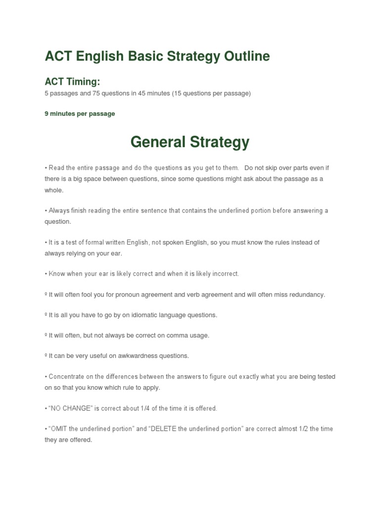 Read the entire passage and do the questions as you get to them. Do not skip over parts even if there is a big space between questions, since some questions might ask about the passage as a whole. Always finish reading the entire sentence that contains the underlined portion before answering a question. It is a test of formal written English, not spoken English, so you must know the rules instead of always relying on your ear. Know when your ear is likely correct and when it is likely incorrect. It will often fool you for pronoun agreement and verb agreement and will often miss redundancy. It is all you have to go by on idiomatic language questions. It will often, but not always be correct on comma usage. It can be very useful on awkwardness questions. Concentrate on the differences between the answers to figure out exactly what you are being tested on so that you know which rule to apply. NO CHANGE is correct about 1/4 of the time it is offered. OMIT the underlined portion and DELETE the underlined portion are correct almost 1/2 the time they are offered.
