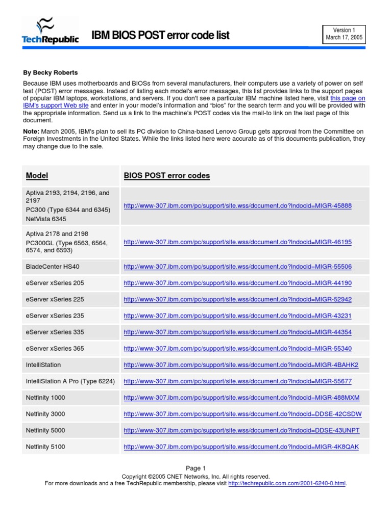 IBM BIOS POST error code list March 17, 2005