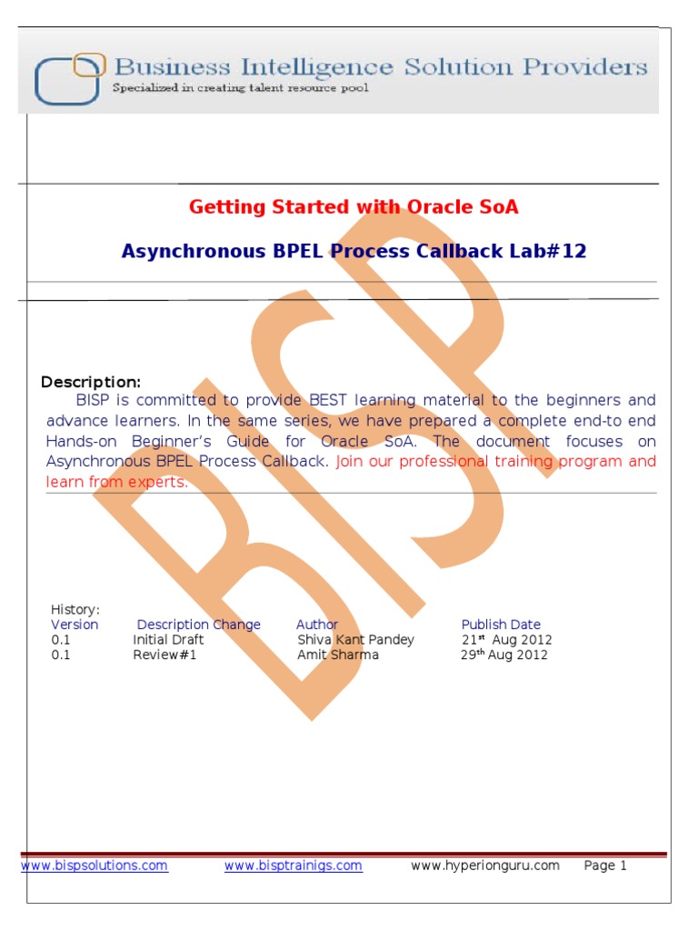 Description: BISP is committed to provide BEST learning material to the beginners and advance learners. In the same series, we have prepared a complete end-to end Hands-on Beginners Guide for Oracle SoA. The document focuses on Asynchronous BPEL Process Callback. Join our professional training program and learn from experts.