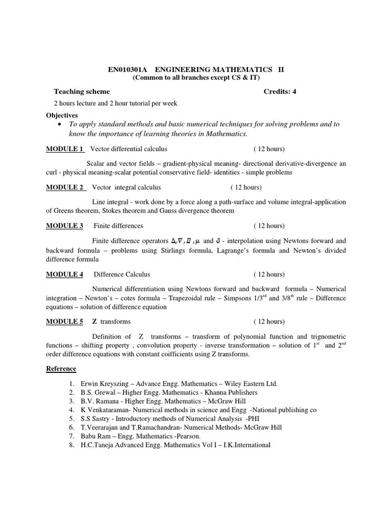Definition of Z transforms transform of polynomial function and trignometric functions shifting property , convolution property - inverse transformation solution of 1st and 2nd order difference equations with constant coifficients using Z transforms. Reference 1. 2. 3. 4. 5. 6. 7. 8. Erwin Kreyszing Advance Engg. Mathematics Wiley Eastern Ltd. B.S. Grewal Higher Engg. Mathematics - Khanna Publishers B.V. Ramana - Higher Engg. Mathematics McGraw Hill K Venkataraman- Numerical methods in science and Engg -National publishing co S.S Sastry - Introductory methods of Numerical Analysis -PHI T.Veerarajan and T.Ramachandran- Numerical Methods- McGraw Hill Babu Ram Engg. Mathematics -Pearson. H.C.Taneja Advanced Engg. Mathematics Vol I I.K.International