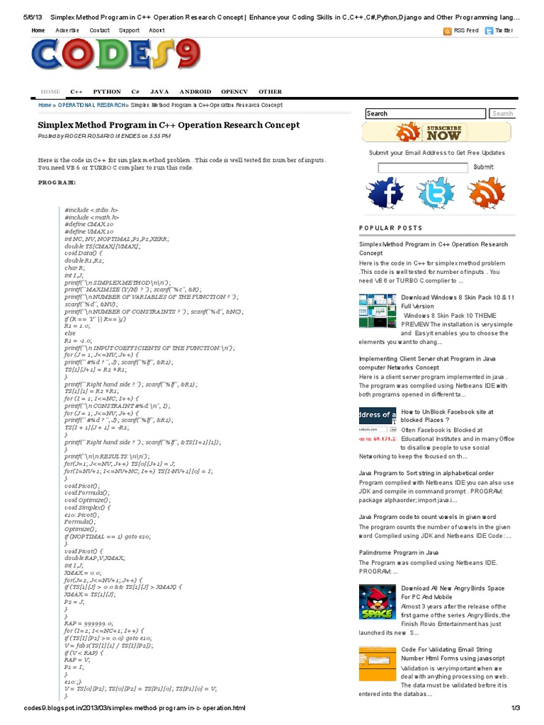 P OP ULAR P OS TS Simplex Method Program in C++ Operation Research Concept Here is the code in C++ for simplex method problem .This code is well tested for number of inputs . You need VB 6 or TURBO C complier to ... Download Windows 8 Skin Pack 10 & 11 Full Version Windows 8 Skin Pack 10 THEME PREVIEW The installation is very simple and Easy it enables you to choose the elements you want to chang... Implementing Client Server chat Program in Java computer Networks Concept Here is a client server program implemented in java . The program was complied using Netbeans IDE with both programs opened in different ta... How to UnBlock Facebook site at blocked Places ? Often Facebook is Blocked at Educational Institutes and in many Office to disallow people to use social Networking to keep the focused on th... Java Program to Sort string in alphabetical order Program complied with Netbeans IDE you can also use JDK and compile in command prompt . PROGRAM: package alphaorder; import java.i... Java Program code to count vowels in given word The program counts the number of vowels in the given word Complied using JDK and Netbeans IDE Code: ... Palindrome Program in Java The Program was complied using Netbeans IDE. PROGRAM: ... Download All New Angry Birds Space For PC And Mobile Almost 3 years after the release of the first game of the series Angry Birds, the Finish Rovio Entertainment has just launched its new S... Code For Validating Email String Number Html Forms using javascript Validation is very important when we deal with anything processing on web. The data must be validated before it is entered into the databas...