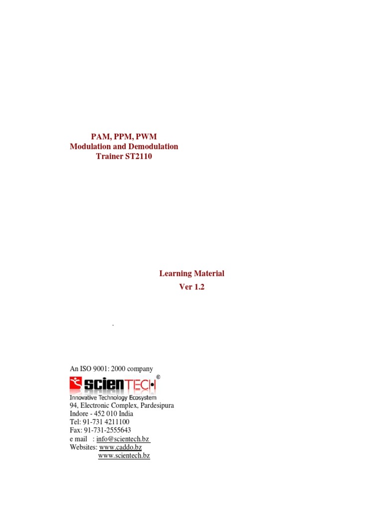 Experiment 9:Study of Voice Link Using Pulse Amplitude Modulation 57 Experiment 10:Study of Voice Link using Pulse Position Modulation Experiment 11:Study of Voice Communication using Pulse Width Modulation 59 61 63 64 67