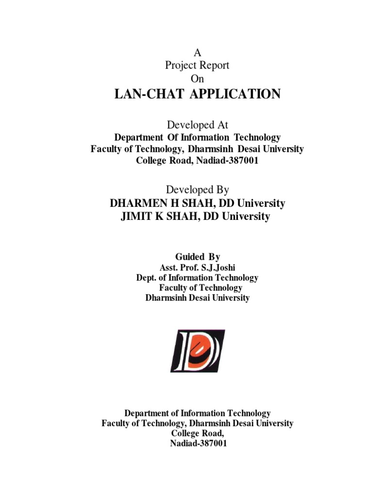 This is to certify that the project carried out in the subject of Software Design Project entitled LAN-CHAT APPLICATION and provided in this report is a bonafied report of the work carried out by Mr. Dharmen H. Shah (ID No: 106093) & Mr. Jimit K. Shah (ID No: 106097) of Department of Information Technology, semester VII, under the guidance and supervision for the award of the Degree of Bachelor of Technology at Dharmsinh Desai University, Nadiad (Gujarat). They were involved in Project training during academic year 2013-2014. Asst. Prof S.J.Joshi (Project Guide) Department of Information Technology, Faculty of Technology, Dharmsinh Desai University, Nadiad Date: