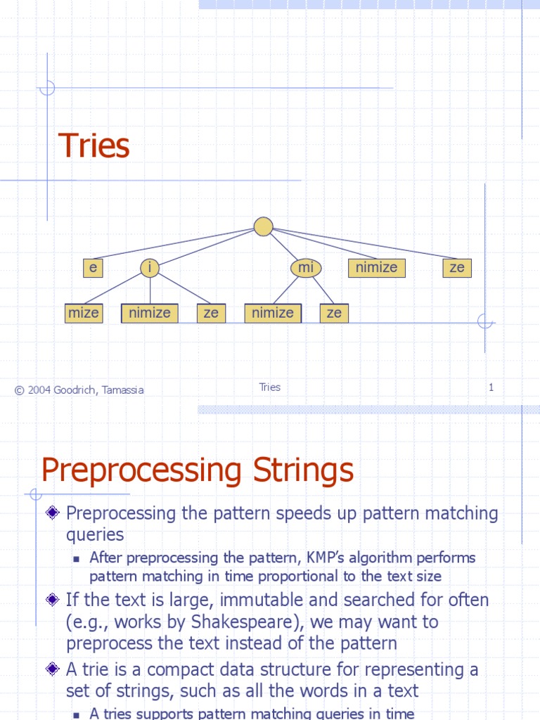 If the text is large, immutable and searched for often (e.g., works by Shakespeare), we may want to preprocess the text instead of the pattern A trie is a compact data structure for representing a set of strings, such as all the words in a text