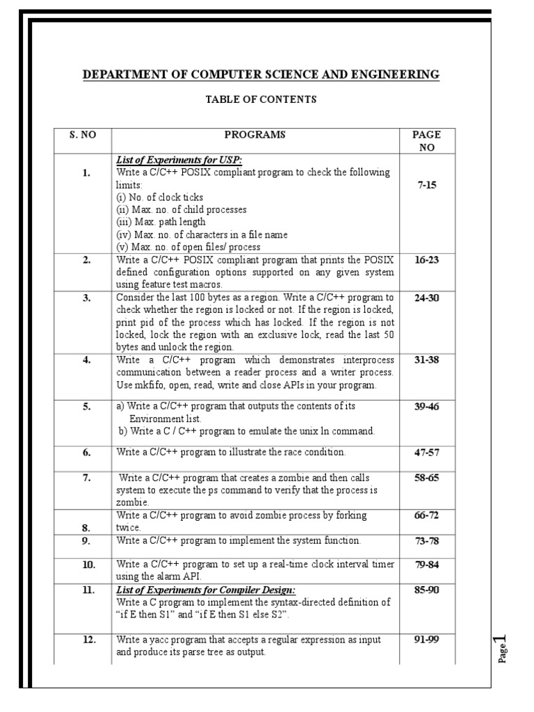 TABLE OF CONTENTS S. NO PROGRAMS List of Experiments for USP: Write a C/C++ POSIX compliant program to check the following limits: (i) No. of clock ticks (ii) Max. no. of child processes (iii) Max. path length (iv) Max. no. of characters in a file name (v) Max. no. of open files/ process Write a C/C++ POSIX compliant program that prints the POSIX defined configuration options supported on any given system using feature test macros. Consider the last 100 bytes as a region. Write a C/C++ program to check whether the region is locked or not. If the region is locked, print pid of the process which has locked. If the region is not locked, lock the region with an exclusive lock, read the last 50 bytes and unlock the region. Write a C/C++ program which demonstrates interprocess communication between a reader process and a writer process. Use mkfifo, open, read, write and close APIs in your program. a) Write a C/C++ program that outputs the contents of its Environment list. b) Write a C / C++ program to emulate the unix ln command. Write a C/C++ program to illustrate the race condition. Write a C/C++ program that creates a zombie and then calls system to execute the ps command to verify that the process is zombie. Write a C/C++ program to avoid zombie process by forking twice. Write a C/C++ program to implement the system function. Write a C/C++ program to set up a real-time clock interval timer using the alarm API. List of Experiments for Compiler Design: Write a C program to implement the syntax-directed definition of if E then S1 and if E then S1 else S2. Write a yacc program that accepts a regular expression as input and produce its parse tree as output. PAGE NO 7-15