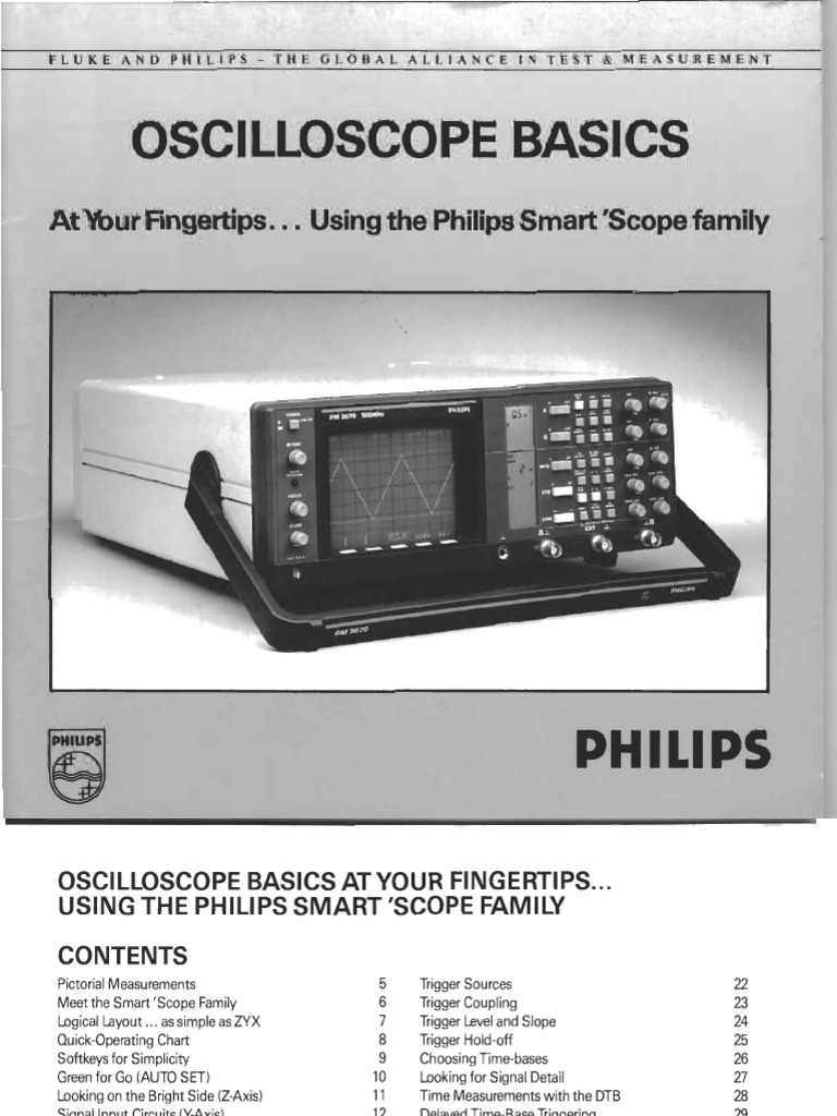 FLUKE AND PHILIPS - THE GLOBAL ALLIANCE IN TEST & MEASUREMENT OSCILLOSCOPE BASICS At Your Fingertips. .. Using the Philips Smart ‘Scope family PHILIPSOSCILLOSCOPE BASICS AT YOUR FINGERTIPS... USING THE PHILIPS SMART ‘SCOPE FAMILY CONTENTS Pictorial Measurements Meet the Smart ‘Scope Family Logical Layout... as simple as ZYX Quick-Operating Chart Softkeys for Simplicity Green for Go (AUTO SET} Looking on the Bright Side (Z-Axis) Signal input Circuits (Y-Axis) Input Coupling Amplitude Adjustment Vertical Positioning and Inverting Combined Operations A+ B,A — Band Trigger View The Time Scale (X-Axis) Magnifying the Time Scale Getting a Stable Display MTB Trigger Modes Trigger Sources Tiigger Coupling Trigger Level and Slope Tiigger Hold-off Choosing Time-bases Looking for Signal Detail Time Measurements with the DTB Delayed Time-Base Triggering Trigger Delay for Jitter free Display X Displays (X DEFL) Extra Timing with Z-modulation Extra Measuring Features Voltage Cursors Time Cursors Risetime Function Zoom Funetion User Text RERESBRBNBRRBLMEET THE SMART ‘SCOPE FAMILY ‘The Philips Smart ‘Scope famiy is a complete, versatile, 60 MHz and 100 MHz oscilloscope system with a choice of standard transportable and rack-mounted units. All this plus an extensive range of system-oriented extras to provide exactly the configurations you need, Options that willaddextra functions, measuring convenienceand greatermobilty to your daily oscilloscope programmes. Brief details ofthe Philips Smart ‘Scope family areincluded here for completeness together with alist of ascessories. For further details please contact your local Fiuke-Philips organisation, Instruments: 60 MHz oscilloscope with single time-base 60 MHz oscilloscope with dual time-base 100 MHz oscilloscope with dual time-base 100 MHz oscilloscope, dual-time base with cursors Options (Factory installed) Rackmount P? Phosphor CRT Y Output ‘Sweep and Gate output Accessories: IEEE-488 Interface for systems with IEEE controllers All oscilloscope functions except potentiometer settings can be remotely controlled. Front-panel memory back-up for storing one front-panel setting even if mains poweris disconnected Oscilloscope adjustable stand Front cover Oscilloscope camera Video line selector ‘Accessory pouch Battery pack Oscilloscope trolley Probes 100 MHz, 10:1, 1.5m, modular with scale read-out 75MHz, 10:1, 2.5m, modular with scale read-out 300MHz, 100:1, 1.5m, modular 15MHz, 1:1, 1.5m, modular 15MHz, _1:1,2.5m, modular 650 MHz, FET probe ‘AC current probe Isolation ampifier.LOGICAL LAYOUT... AS SIMPLE AS ZYX The Smart Scope famity of oscilloscopes chosen for this instruction manual have an ergonomically designed front panel layout that makes operating as easy as reading a book - a mainly lett-to-ight, top-to-bottom logical sequence of fingertip operations. Even the front panel ZYX clvision into the three basic classification is simpler than it sounds. After switch-on, no need to hunt for the trace - the press of an AUTOSET button (Green for GO) gives automatic Settings of all scope parameters for the connected input signal. ‘And optimum trace and spot quality is easily set by the left-hand Z controls INTENS and FOCUS. Eyes right then for the vertical (Y) display parameter controls: Up/Down rockers for vertical amplitude, function pushbuttons and Y position variable controls. Finally, eyes down for the X-axis controls: MTB, DTB rockers, X position variable controls, function pushbuttons and triggering controls.QUICK-OPERATING CHART AFTER POWER ON PRESS AUTO SET TO SELECT TIME, AMPLITUDEAND. TRIGGER OF YOUR INPUT SIGNALIS) ‘VARIABLE CONTROL OF CHANNEL AMPLITUDE OR ‘MAIN TIME Base FLASHING" > "IN UNCAL [e) at. f KoRonral Posi 6 CONTR ‘ABIABLE CONTROL TO SET THE LEVEL OFTHE TRIGGER POINT AT WHI THENTB STARTS {VARIABLE CONTADL OF “TE MOUD OFF TIME BETWEEN MTB SEEPS ‘VARIABLE CONTROL TO SETTHE LEVEL OF THE TRIGGER PONT AT WHO THEDTE STARTS iL auTPIT Socket eaov NGA 2 Wop ice BATINPITSOOKETUR VIABLE COTaDL TO speak Sia Wave Exehaliacaeancos | [exc npursoocerrom | | SErTHEOT Senay fe cauaeaiow on TCD PANEL: DIETS SHLETED HOROWAL OER VomLoMinas | | PosToNWeN ose PROBE RDWUSTWENT FUNCTIONS STINGS APABAWETEAS | | TON wing ecocwcea | | NGA aNO a 8SOFTKEYS FOR SIMPLICITY ‘Anin-depth view of the options behind the multi-function keys. auto uP -DowN Ser a CONTROLS LJ L_ Al SELECTION OF Ch.A hy DEFLECTION COEFFICIENT we die As HOF 100 se ono DEFLECTION COEFFICIENT [—) LW Joon 78 Terme selics Boas i fi em SELECTION OF MAIN TIME wwr9fia) SEE : . SELECTION OF DELAYED TIME BASE DEFLECTION COEFFICIENT Ie, Ie IK 4 je IP Ear ext acioc we DELAYTIME conTRot # To look down the menu! Press MENU for learning mode. = Press any softkey for an automatic indepth view ofits step functions.GREEN FOR GO! Unlike conventional oscilloscopes, getting started after switching on a Philips SMART SCOPE is easy: - first connect your signal under test, any signal; ~ check the INTENS and Y POS controls are at “12o'clock”; ~ press the green AUTOSET button. Settings for amplitude, time-base ard triggering are then ‘brought into range. For convenience, only the selected functions, channel, ampiitude, time-base and triggering are displayed on the LCD panel -no more, no less! Forexample, connectthe CAL signaltochannel A input; = Press AUTOSET 0 The display shown will be obtained automatically ‘The LCD willindicate: f ric | Yamphsetting 05Vidiv Uae AC-coupled, , ~ channel A selected ~ Tiggered ~ Main Time-base selected me ne-base 5 ~ Automatic triggering ie |= MTB speed 0:Ims/div ain ue ~ Trigger source:channel A triggers on +ve slope, ~ pk-pk trigger coupling ‘The display shows that the CAL signalisa square-wave of 2kHz, amplitude 12V.LOOKING ON THE BRIGHT SIDE (Z-AXIS) COnthe left we have the controls that influence the display of the electron beam on the CRT. After intial ajusment they rarely need to be touched, INTENS: controls the brightness of the displ