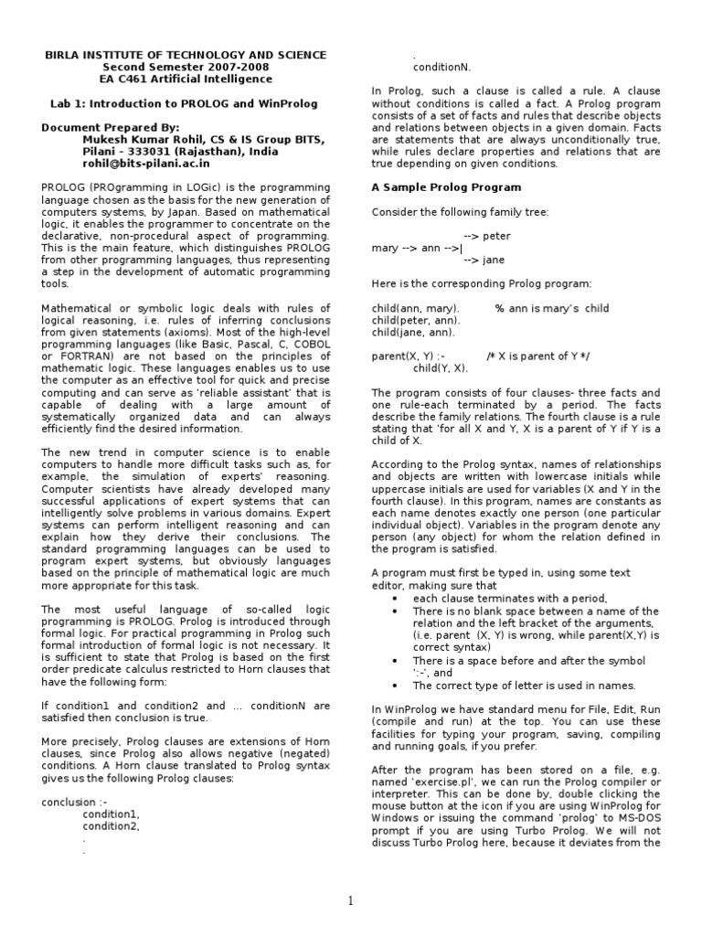 Lab 1: Introduction to PROLOG and WinProlog without conditions is called a fact. A Prolog program