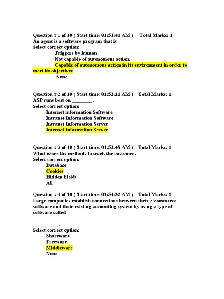 Question # 3 of 10 ( Start time: [Link] AM ) Total Marks: 1 What is/are the methods to track the customer. Select correct option: Database Cookies Hidden Fields All Question # 4 of 10 ( Start time: [Link] AM ) Total Marks: 1 Large companies establish connections between their e-commerce software and their existing accounting system by using a type of software called __________. Select correct option: Shareware Freeware Middleware None