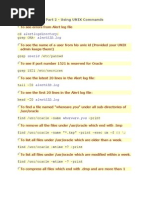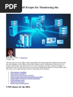 and techniques on how DBAs can turn their manual, r eactive monitoring activities into a set of proactive shell scripts. The articl e first reviews some commonly used Unix commands by DBAs. It explains the Unix Cron jobs that are used as part of the scheduling mechanism to execute DBA scri pts. The article covers eight important scripts for monitoring Oracle database: + Check instance availability + Check listener availability + Check alert log files for error messages + Clean up old log files before log destination gets filled + Analyze tables and indexes for better performance + Check tablespace usage + Find out invalid objects + Monitor users and transactions UNIX Basics for the DBA Basic UNIX Command The following is a list of commonly used Unix command: + ps - Show process + grep - Search files for text patterns + mailx - Read or send mail + cat - Join files or display them + cut - Select columns for display + awk - Pattern-matching language +