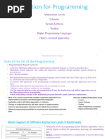 o Imperative languages Goal is to understand a machine state (set of memory locations, each containing a value) Statement oriented languages that change machine state (C, Pascal, FORTRAN, COBOL) Syntax: Statement1; Statement2; . Applicative (functional) languages Goal is to understand the function that produces the answer Function composition is major operation (ML, LISP) Syntax: functionN(function2(function1 (data))) Programming consists of building the function that computes the answer Rule-based languages Rule-based or logical languages execute by checking for the presence of a certain condition and when it is satisfied, they execute an appropriate action. Specify rule that specifies problem solution (Prolog, BNF Parsing) Other examples: Decision procedures, Grammar rules (BNF) Programming consists of specifying the attributes of the answer The syntax has the form like: enabling condition1 action1 enabling condition2 action2 enabling conditionN actionN Object-oriented languages Object-oriented languages can be viewed as combining imperative and functional paradigms. Abstract data types inheritance efficiency of imperative languages Flexibility and reliability of functional languages. Syntax: Set of objects (classes) containing data (imperative concepts) and methods (applicative concepts) e.g. Java, C++, Smalltalk