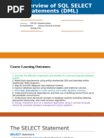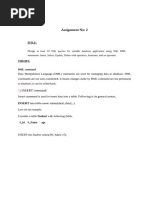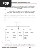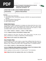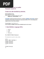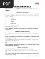 AIM To study the various categories of DML commands such as logical operations, aggregate functions, string functions , numeric functions, date functions, conversion functions and group functions, set operations, join operations and nested queries.. DESCRIPTION THE ORACLE TABLE DUAL Dual is a small oracle table which consists of only one row and one column and contains the value X in that column. INSERT This command is used to insert values into the table. SELECT This command is used to display the contents of the table or those of a particular column. RENAME This command renames the name of the table. ARITHMETIC OPERATIONS Various operations such as addition, multiplication, subtraction and division can be performed using the numbers available in the table. DISTINCT This keyword is used along with select keyword to display unique values from the specified column. It avoids duplicates during display. ORDER BY CLAUSE The order by clause arranges the contents of the table in ascending order (by default) or in descending order (if specified explicitly) according to the specified column. CONCATENATION OPERATOR This combines information from two or more columns in a sentence according to the format specified. LOGICAL OPERATORS AND : The oracle engine will process all rows in a table and displays the result only when all of the conditions specified using the AND operator are specified. OR : The oracle engine will process all rows in a table and displays the result only when any of the conditions specified using the OR operators are satisfied. NOT : The oracle engine will process all rows in a table and displays the result only when none of the conditions specified using the NOT operator are specified. BETWEEN : In order to select data that is within a range of values, the between operator is used. (AND should be included)