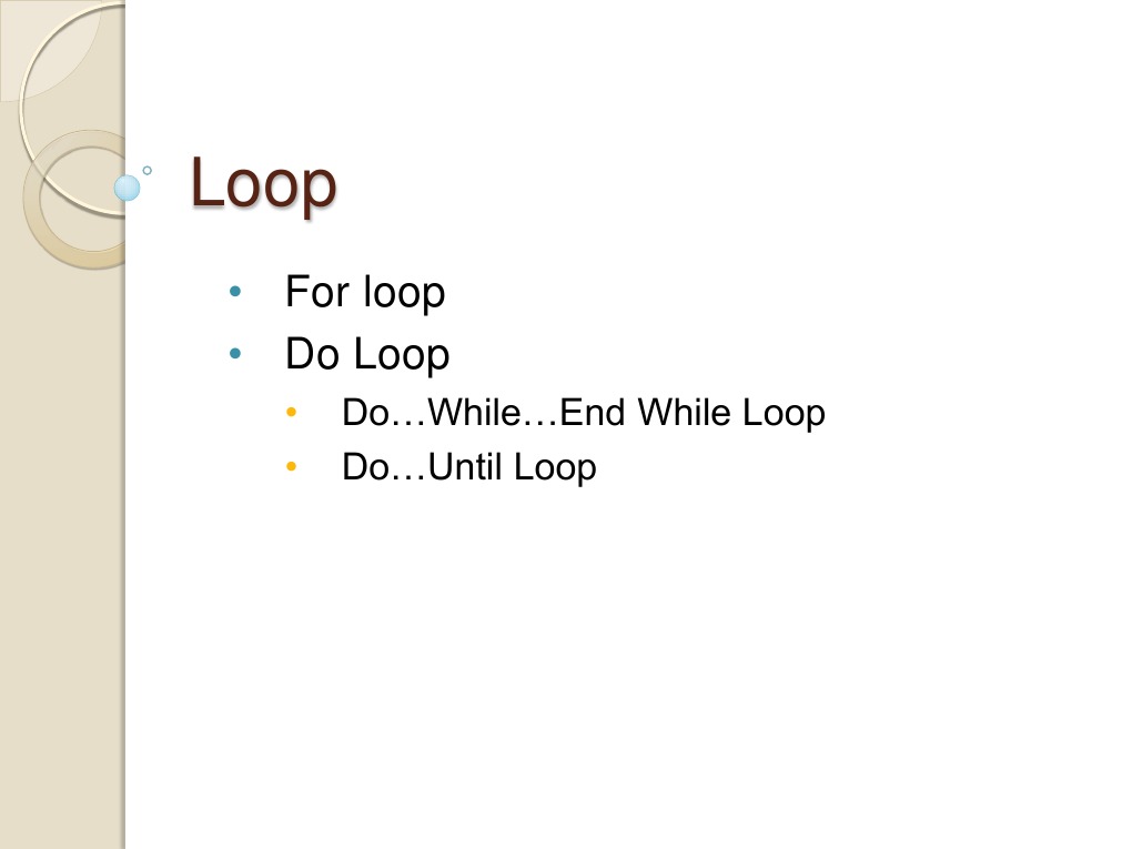 if we don't know how many times around the loop we want to go? Use for reading of text file. With a Do Loop we can use word s like While and Until.