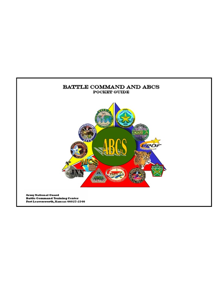 This pocket guide has been prepared to provide a quick reference for Soldiers who utilize the various systems and supporting communications equipment in the Army Battle Command System (ABCS) which enable a digital battlefield to frame an architecture of every stationary and moving platform in the operational environment / area of operations (AO). This guide was prepared by the Army National Guard (ARNG) Battle Command Training Center (BCTC) at Fort Leavenworth, Kansas, and is derived from the January 2011 edition of The Azimuth, entitled, Battle Command and ABCS, Volume 3. While annual copies of The Azimuth are devoted to ABCS updates, their size sometimes complicates carry-around convenience for the Soldier. This guides cargo pocket design alleviates that problem, and although systems are updated and software versions change, it will still provide valuable information on the basic capabilities that are available to the Soldier.