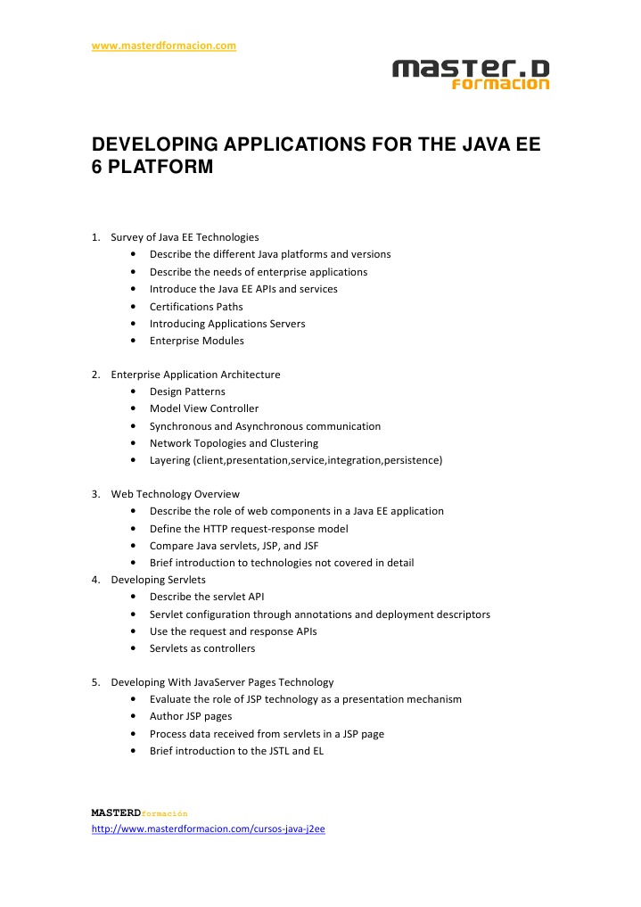 1. Survey of Java EE Technologies Describe the different Java platforms and versions Describe the needs of enterprise applications Introduce the Java EE APIs and services Certifications Paths Introducing Applications Servers Enterprise Modules 2. Enterprise Application Architecture Design Patterns Model View Controller Synchronous and Asynchronous communication Network Topologies and Clustering Layering (client,presentation,service,integration,persistence) 3. Web Technology Overview Describe the role of web components in a Java EE application Define the HTTP request-response model Compare Java servlets, JSP, and JSF Brief introduction to technologies not covered in detail 4. Developing Servlets Describe the servlet API Servlet configuration through annotations and deployment descriptors Use the request and response APIs Servlets as controllers 5. Developing With JavaServer Pages Technology Evaluate the role of JSP technology as a presentation mechanism Author JSP pages Process data received from servlets in a JSP page Brief introduction to the JSTL and EL