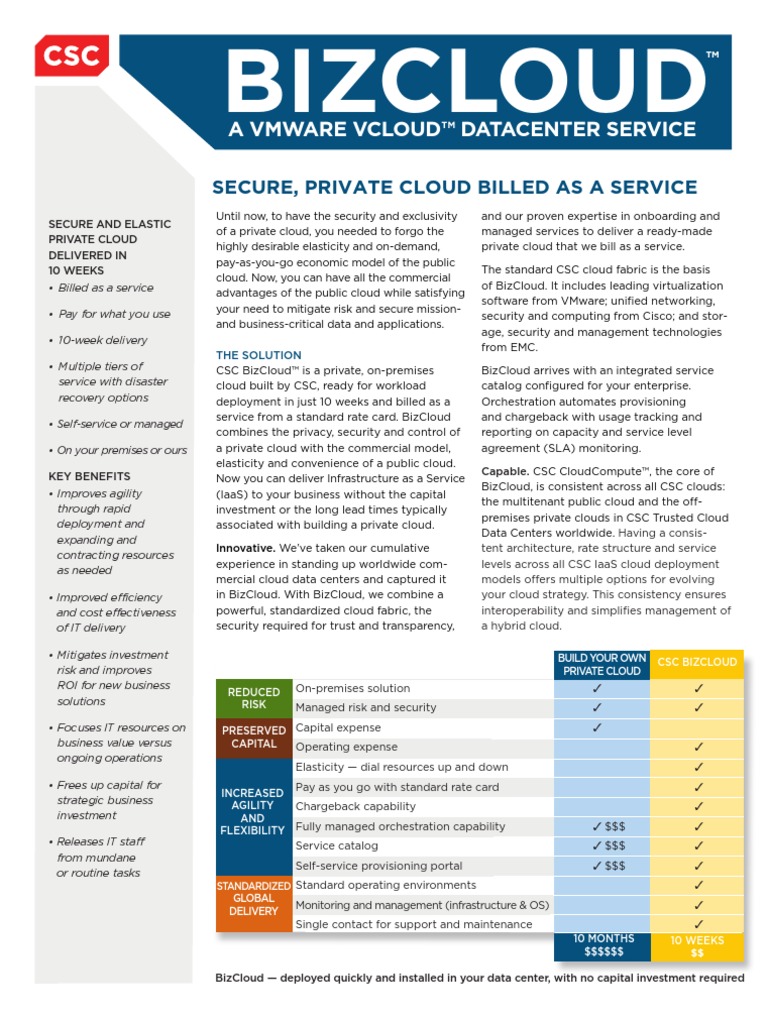 and our proven expertise in onboarding and managed services to deliver a ready-made private cloud that we bill as a service. The standard CSC cloud fabric is the basis of BizCloud. It includes leading virtualization software from VMware; unified networking, security and computing from Cisco; and storage, security and management technologies from EMC. BizCloud arrives with an integrated service catalog configured for your enterprise. Orchestration automates provisioning and chargeback with usage tracking and reporting on capacity and service level agreement (SLA) monitoring. Capable. CSC CloudCompute, the core of BizCloud, is consistent across all CSC clouds: the multitenant public cloud and the offpremises private clouds in CSC Trusted Cloud Data Centers worldwide. Having a consistent architecture, rate structure and service levels across all CSC IaaS cloud deployment models offers multiple options for evolving your cloud strategy. This consistency ensures interoperability and simplifies management of a hybrid cloud.