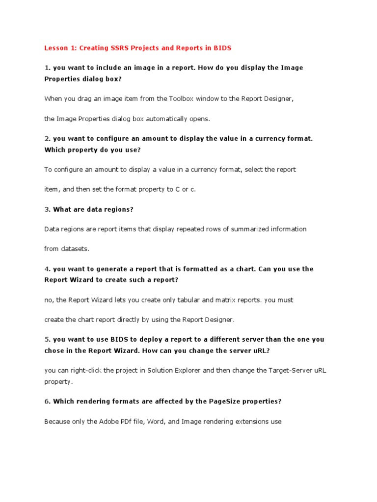 How do you display the Image Properties dialog box? When you drag an image item from the Toolbox window to the Report Designer, the Image Properties dialog box automatically opens. 2. you want to configure an amount to display the value in a currency format. Which property do you use? To configure an amount to display a value in a currency format, select the report item, and then set the format property to C or c. 3. What are data regions? Data regions are report items that display repeated rows of summarized information from datasets. 4. you want to generate a report that is formatted as a chart. Can you use the Report Wizard to create such a report? no, the Report Wizard lets you create only tabular and matrix reports. you must create the chart report directly by using the Report Designer. 5. you want to use BIDS to deploy a report to a different server than the one you chose in the Report Wizard. How can you change the server uRL? you can right-click the project in Solution Explorer and then change the Target-Server uRL property. 6. Which rendering formats are affected by the PageSize properties? Because only the Adobe PDf file, Word, and Image rendering extensions use