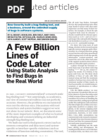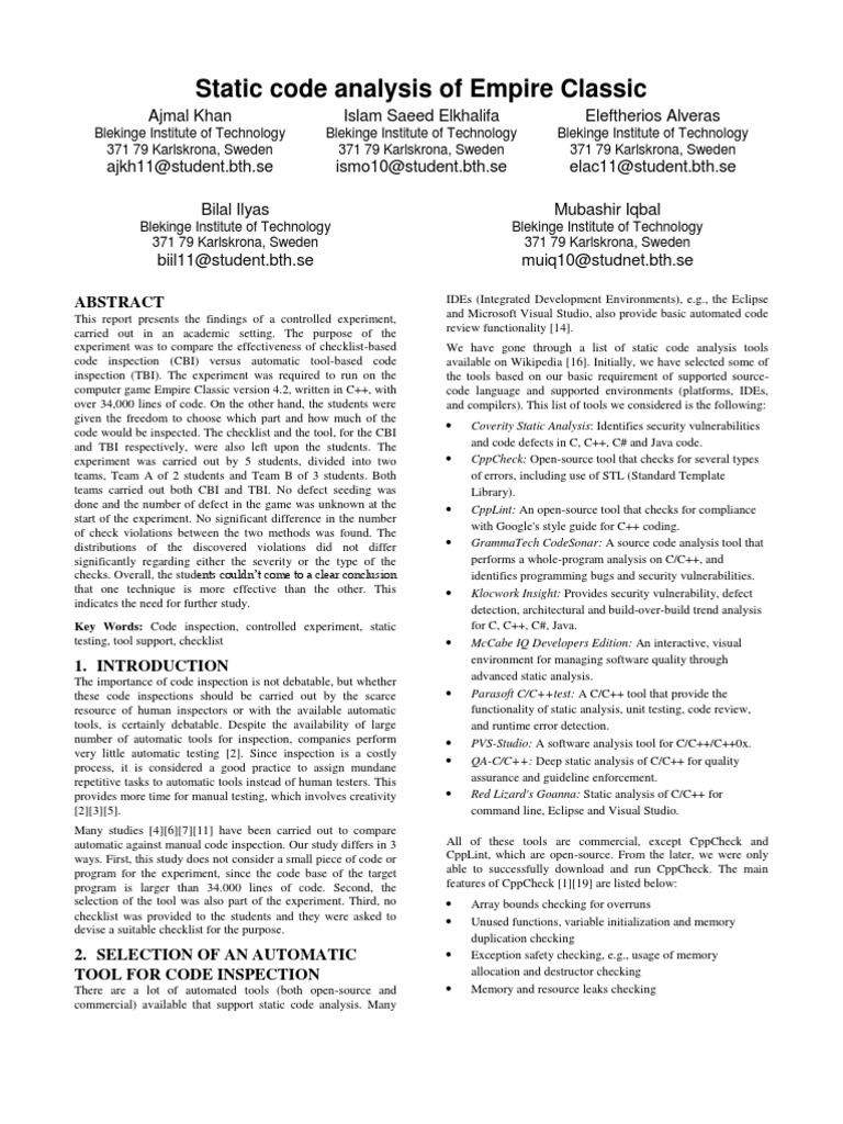 conference on Innovative applications of artificial intelligence (1992), 295314. [5] Fewster, M. and Graham, D. 1999. Software Test Automation. Addison-Wesley Professional. [6] Gintell, J. et al. 1993. Scrutiny: A Collaborative Inspection and Review System. Proceedings of the 4th European Software Engineering Conference on Software Engineering (London, UK, UK, 1993), 344360. [7] Gintell, J.W. et al. 1995. Lessons learned by building and using Scrutiny, a collaborative software inspection system. Computer-Aided Software Engineering, 1995. Proceedings., Seventh International Workshop on (Jul. 1995), 350 357. [8] Itkonen, J. et al. 2007. Defect Detection Efficiency: Test Case Based vs. Exploratory Testing. Empirical Software Engineering and Measurement, 2007. ESEM 2007. First International Symposium on (Sep. 2007), 61 70. [9] Juristo, N. and Moreno, A.M. 2001. Basics of Software Engineering Experimentation. Springer. [10] Kitchenham, B.A. et al. 2002. Preliminary guidelines for empirical research in software engineering. Software Engineering, IEEE Transactions on. 28, 8 (Aug. 2002), 721 734. [11] MacDonald, F. and Miller, J. 1998. A Comparison of Tool-Based and Paper-Based Software Inspection. Empirical Softw. Engg. 3, 3 (Sep. 1998), 233253. [12] McCabe, T.J. 1976. A Complexity Measure. Software Engineering, IEEE Transactions on. SE-2, 4 (Dec. 1976), 308 320. [13] Munson, J.C. and Khoshgoftaar, T.M. 1992. The Detection of Fault-Prone Programs. IEEE Trans. Softw. Eng. 18, 5 (May. 1992), 423433. [14] Wikipedia contributors 2012. Automated code review. Wikipedia, the free encyclopedia. Wikimedia Foundation, Inc. [15] Wikipedia contributors 2011. Imagix 4D. Wikipedia, the free encyclopedia. Wikimedia Foundation, Inc. [16] Wikipedia contributors 2012. List of tools for static code analysis. Wikipedia, the free encyclopedia. Wikimedia Foundation, Inc. [17] Yu, Y. et al. 2005. RETR: Reverse Engineering to Requirements. Reverse Engineering, 12th Working Conference on (Nov. 2005), 234. [18] C++TestDataSheet.pdf. http://www.parasoft.com/jsp/printables/C++TestDataShe et.pdf?path=/jsp/products/cpptest.jsp&product=CppTest [19] manual.pdf. http://cppcheck.sourceforge.net/manual.pdf [20] Fagan, M.E., Advances in Software Inspections, July 1986, IEEE Transactions on Software Engineering, Vol. SE-12, No. 7, Page 744-751