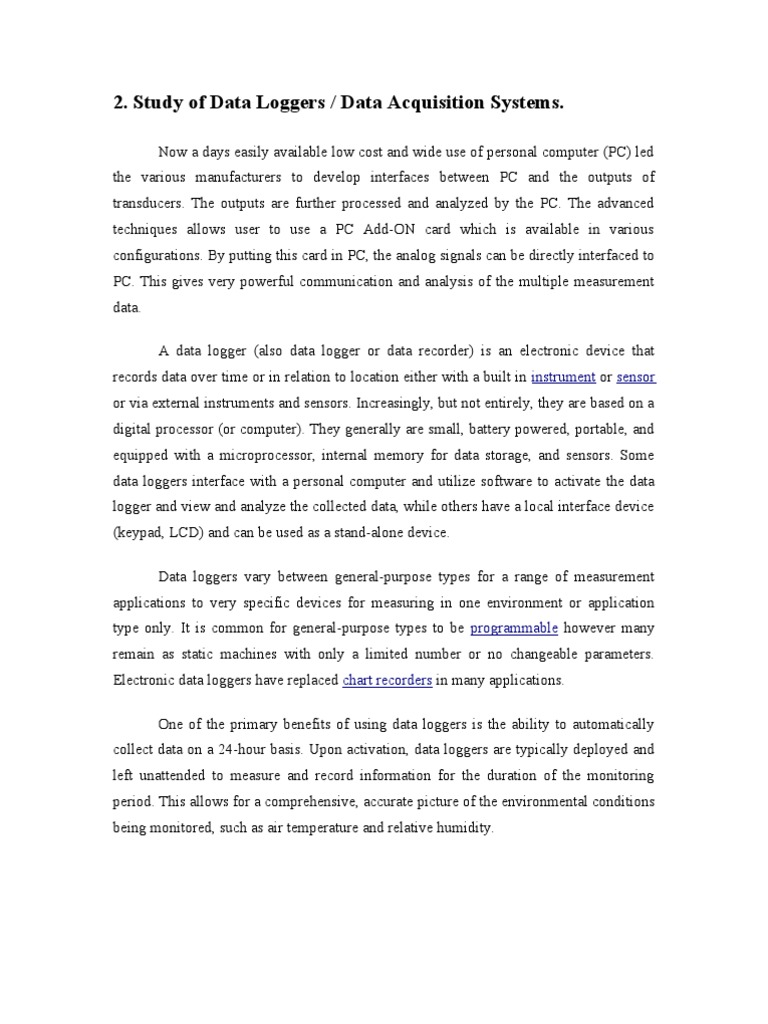 Now a days easily available low cost and wide use of personal computer (PC) led the various manufacturers to develop interfaces between PC and the outputs of transducers. The outputs are further processed and analyzed by the PC. The advanced techniques allows user to use a PC Add-ON card which is available in various configurations. By putting this card in PC, the analog signals can be directly interfaced to PC. This gives very powerful communication and analysis of the multiple measurement data. A data logger (also data logger or data recorder) is an electronic device that records data over time or in relation to location either with a built in instrument or sensor or via external instruments and sensors. Increasingly, but not entirely, they are based on a digital processor (or computer). They generally are small, battery powered, portable, and equipped with a microprocessor, internal memory for data storage, and sensors. Some data loggers interface with a personal computer and utilize software to activate the data logger and view and analyze the collected data, while others have a local interface device (keypad, LCD) and can be used as a stand-alone device. Data loggers vary between general-purpose types for a range of measurement applications to very specific devices for measuring in one environment or application type only. It is common for general-purpose types to be programmable however many remain as static machines with only a limited number or no changeable parameters. Electronic data loggers have replaced chart recorders in many applications. One of the primary benefits of using data loggers is the ability to automatically collect data on a 24-hour basis. Upon activation, data loggers are typically deployed and left unattended to measure and record information for the duration of the monitoring period. This allows for a comprehensive, accurate picture of the environmental conditions being monitored, such as air temperature and relative humidity.
