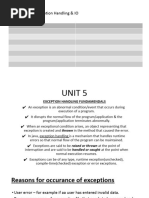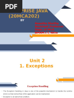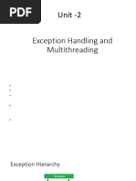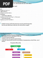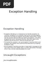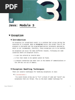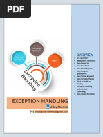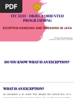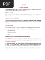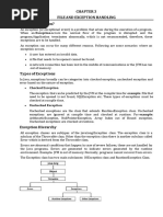 } } catch (ArrayIndexOutOfBoundsException e) { System.out.println ("Array out of bound "); } catch (ArithmeticException e) { System.out.println ("Zero divide error"); } } } Output: Zero divide error Throwing an Exception We can throw an exception explicitly using the throw statement. Using the throw Statement It is possible for your program to throw an exception explicitly, using the throw statement. The general form of throw is shown here: throw ThrowableInstance; 1. The throw statement causes termination of the normal flow of control of the java code and prevents the execution of the subsequent statements. 2. The throw clause convey the control to the nearest catch block handling the type of exception object throws. 3. If no such catch block exists, the program terminates. class demo { public static void main (String args[ ]) { try { throw new IllegalStateException (); } catch (NullPointerException e) { System.out.println ("Not Caught by the catch block inside tdemo ()."); } catch(IllegalStateException e) { System.out.println("Exception Caught in:" + e); } } } Exception Caught in:java.lang.IllegalStateException Using the throws Statement The throws statement is used by a method to specify the types of exceptions the method throws. If a method is capable of raising an exception that it does not handle, the method must specify that the exception have to be handled by the calling method. A throws clause lists the types of exceptions that a method might throw. This is the general form of a method declaration that includes a throws clause: