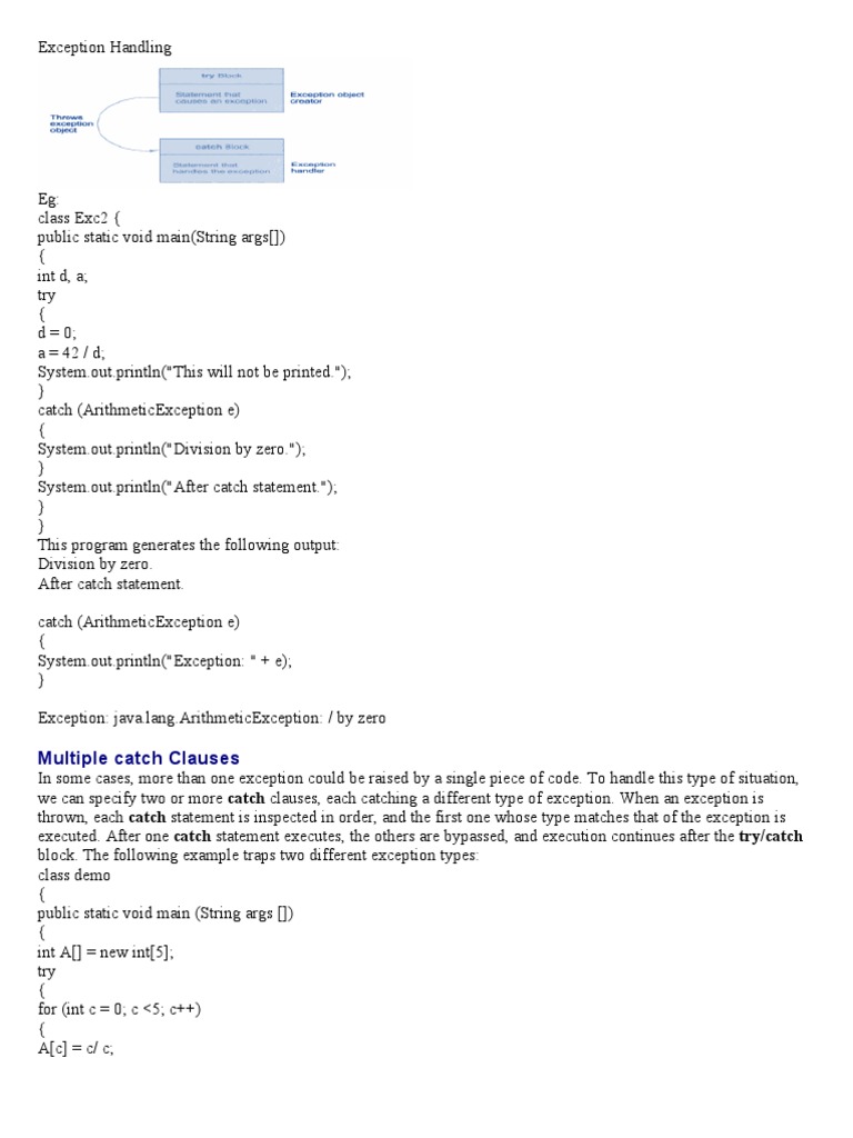 In some cases, more than one exception could be raised by a single piece of code. To handle this type of situation, we can specify two or more catch clauses, each catching a different type of exception. When an exception is thrown, each catch statement is inspected in order, and the first one whose type matches that of the exception is executed. After one catch statement executes, the others are bypassed, and execution continues after the try/catch block. The following example traps two different exception types: class demo { public static void main (String args []) { int A[] = new int[5]; try { for (int c = 0; c <5; c++) { A[c] = c/ c;