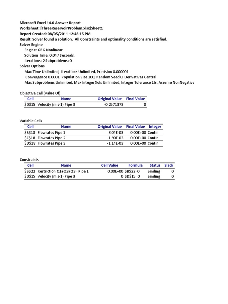 All Constraints and optimality conditions are satisfied. Solver Engine Engine: GRG Nonlinear Solution Time: 0.047 Seconds. Iterations: 2 Subproblems: 0 Solver Options Max Time Unlimited, Iterations Unlimited, Precision 0.000001 Convergence 0.0001, Population Size 100, Random Seed 0, Derivatives Central Max Subproblems Unlimited, Max Integer Sols Unlimited, Integer Tolerance 1%, Assume NonNegative Objective Cell (Value Of) Cell Name $D$15 Velocity (m s-1) Pipe 3