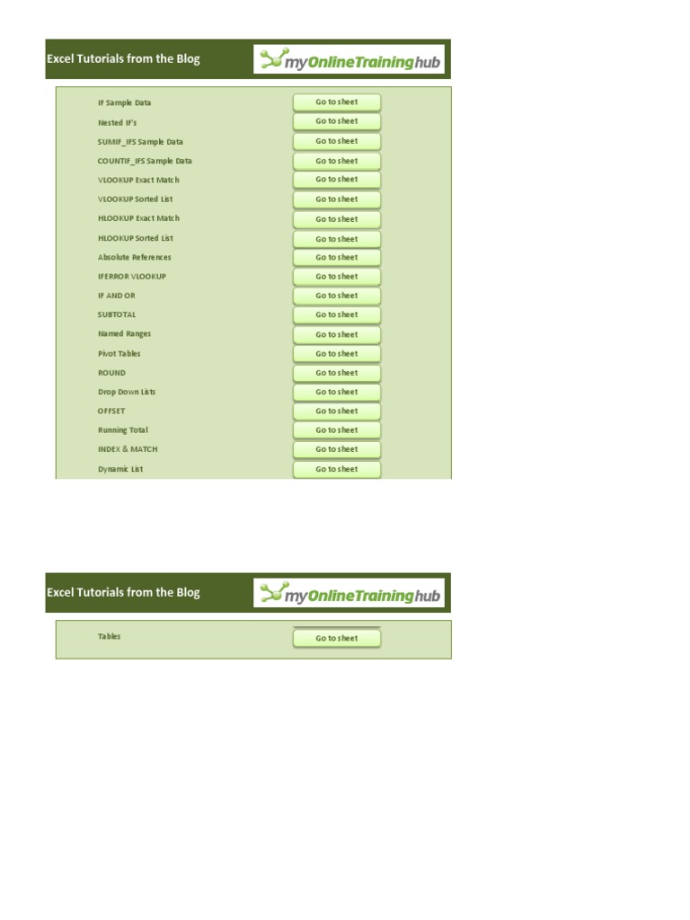 IF Sample Data Nested IF's SUMIF_IFS Sample Data COUNTIF_IFS Sample Data VLOOKUP Exact Match VLOOKUP Sorted List HLOOKUP Exact Match HLOOKUP Sorted List Absolute References IFERROR VLOOKUP IF AND OR SUBTOTAL Named Ranges Pivot Tables ROUND Drop Down Lists OFFSET Running Total INDEX & MATCH Dynamic List