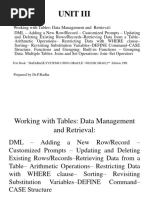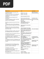 (SELECT HISAL FROM SALGRADE WHERE GRADE=TO_CHAR(HIREDATE,'MM')); 194. Display those employee whose joining DATE is available in deptno. A) SELECT ENAME FROM EMP WHERE TO_CHAR(HIREDATE,'DD')=DEPTNO 195. Display those employees name as follows A ALLEN B BLAKE A) SELECT SUBSTR(ENAME,1,1),ENAME FROM EMP; 196. List out the employees ename,sal,PF(20% OF SAL) from emp; A) SELECT ENAME,SAL,SAL*.2 AS PF FROM EMP; 197. Display RSPS from emp without using updating inserting. A) 198. Create table emp with only one column empno; A) create table emp as select empno from emp where 1=2; 199. Add this column to emp table ename vrachar2(20). a) alter table emp add(ename varchar2(20)); 200. Oops I forgot give the primary key constraint. Add in now. a) alter table emp add primary key(empno); 201. Now increase the length of ename column to 30 characters.