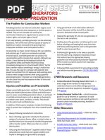 Portable generators are internal combustion engines used to generate electricity. They are useful when temporary or remote power is needed, and are commonly used during cleanup and recovery efforts following disasters such as hurricanes, tornadoes, etc. This fact sheet discusses specific hazards inherent with the use of generators and also provides helpful information to ensure that workers and others using such equipment remain safe. Hazards Associated with Generators: