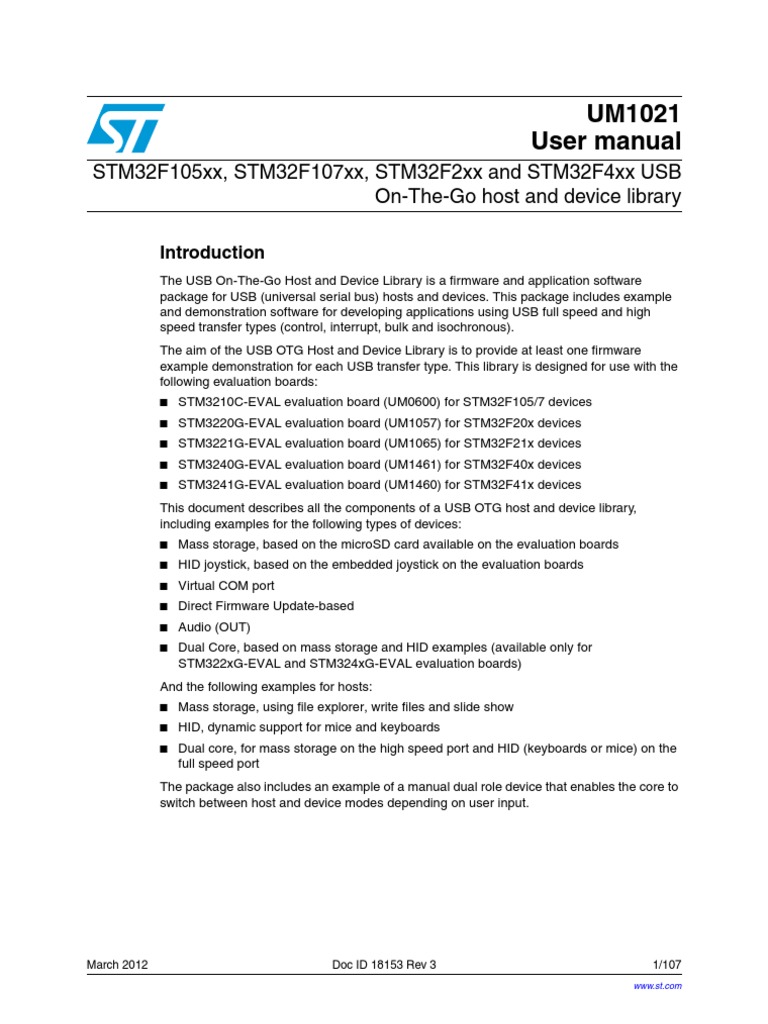 Table 1. Table 2. Table 3. Table 4. Table 5. Table 6. Table 7. Table 8. Table 9. Table 10. Table 11. Table 12. Table 13. Table 14. Table 15. Table 16. Table 17. Table 18. Table 19. Table 20. Table 21. Table 22. Table 23. Table 24. Table 25. Table 26. Table 27. Table 28. Table 29. Table 30. Table 31. Table 32. Table 33. Table 34. Table 35. Table 36. Table 37. Table 38. Table 39. Table 40. Table 41. Table 42. List of terms . . . . . . . . . . . . . . . . . . . . . . . . . . . . . . . . . . . . . . . . . . . . . . . . . . . . . . . . . . . . . 8 USB OTG low level file descriptions . . . . . . . . . . . . . . . . . . . . . . . . . . . . . . . . . . . . . . . . . . 14 Core configurations. . . . . . . . . . . . . . . . . . . . . . . . . . . . . . . . . . . . . . . . . . . . . . . . . . . . . . . 14 Standard requests . . . . . . . . . . . . . . . . . . . . . . . . . . . . . . . . . . . . . . . . . . . . . . . . . . . . . . . 26 USB device core files . . . . . . . . . . . . . . . . . . . . . . . . . . . . . . . . . . . . . . . . . . . . . . . . . . . . . 32 usbd_core (.c, .h) files . . . . . . . . . . . . . . . . . . . . . . . . . . . . . . . . . . . . . . . . . . . . . . . . . . . . 32 usbd_ioreq (.c, .h) files . . . . . . . . . . . . . . . . . . . . . . . . . . . . . . . . . . . . . . . . . . . . . . . . . . . . 33 usbd_req (.c, .h) . . . . . . . . . . . . . . . . . . . . . . . . . . . . . . . . . . . . . . . . . . . . . . . . . . . . . . . . . 34 USB device class files . . . . . . . . . . . . . . . . . . . . . . . . . . . . . . . . . . . . . . . . . . . . . . . . . . . . 38 usbd_hid_core.c,h files . . . . . . . . . . . . . . . . . . . . . . . . . . . . . . . . . . . . . . . . . . . . . . . . . . . . 39 SCSI commands . . . . . . . . . . . . . . . . . . . . . . . . . . . . . . . . . . . . . . . . . . . . . . . . . . . . . . . . . 41 usbd_msc_core (.c, .h) files . . . . . . . . . . . . . . . . . . . . . . . . . . . . . . . . . . . . . . . . . . . . . . . . 42 usbd_msc_bot (.c, .h) files . . . . . . . . . . . . . . . . . . . . . . . . . . . . . . . . . . . . . . . . . . . . . . . . . 42 usbd_msc_scsi (.c, .h) . . . . . . . . . . . . . . . . . . . . . . . . . . . . . . . . . . . . . . . . . . . . . . . . . . . . 43 Functions . . . . . . . . . . . . . . . . . . . . . . . . . . . . . . . . . . . . . . . . . . . . . . . . . . . . . . . . . . . . . . 44 DFU states . . . . . . . . . . . . . . . . . . . . . . . . . . . . . . . . . . . . . . . . . . . . . . . . . . . . . . . . . . . . . 46 Supported requests . . . . . . . . . . . . . . . . . . . . . . . . . . . . . . . . . . . . . . . . . . . . . . . . . . . . . . 48 usbd_dfu_core (.c, .h) files . . . . . . . . . . . . . . . . . . . . . . . . . . . . . . . . . . . . . . . . . . . . . . . . . 48 usbd_dfu_mal (.c, .h) files. . . . . . . . . . . . . . . . . . . . . . . . . . . . . . . . . . . . . . . . . . . . . . . . . . 49 usbd_flash_if (.c,.h) files . . . . . . . . . . . . . . . . . . . . . . . . . . . . . . . . . . . . . . . . . . . . . . . . . . . 51 Audio control requests . . . . . . . . . . . . . . . . . . . . . . . . . . . . . . . . . . . . . . . . . . . . . . . . . . . . 53 usbd_audio_core (.c, .h) files . . . . . . . . . . . . . . . . . . . . . . . . . . . . . . . . . . . . . . . . . . . . . . . 54 usbd_audio_xxx_if (.c, .h) files . . . . . . . . . . . . . . . . . . . . . . . . . . . . . . . . . . . . . . . . . . . . . . 55 Audio player states . . . . . . . . . . . . . . . . . . . . . . . . . . . . . . . . . . . . . . . . . . . . . . . . . . . . . . . 55 usbd_cdc_core (.c, .h) files . . . . . . . . . . . . . . . . . . . . . . . . . . . . . . . . . . . . . . . . . . . . . . . . . 58 Configurable CDC parameters . . . . . . . . . . . . . . . . . . . . . . . . . . . . . . . . . . . . . . . . . . . . . . 59 usbd_cdc_xxx_if (.c, .h) files. . . . . . . . . . . . . . . . . . . . . . . . . . . . . . . . . . . . . . . . . . . . . . . . 59 Variables used by usbd_cdc_xxx_if.c/.h . . . . . . . . . . . . . . . . . . . . . . . . . . . . . . . . . . . . . . . 60 USB host core files . . . . . . . . . . . . . . . . . . . . . . . . . . . . . . . . . . . . . . . . . . . . . . . . . . . . . . . 79 USB I/O request module . . . . . . . . . . . . . . . . . . . . . . . . . . . . . . . . . . . . . . . . . . . . . . . . . . . 80 Host channel control module . . . . . . . . . . . . . . . . . . . . . . . . . . . . . . . . . . . . . . . . . . . . . . . 80 Standard request module . . . . . . . . . . . . . . . . . . . . . . . . . . . . . . . . . . . . . . . . . . . . . . . . . . 80 Modules . . . . . . . . . . . . . . . . . . . . . . . . . . . . . . . . . . . . . . . . . . . . . . . . . . . . . . . . . . . . . . . 82 MSC core module description. . . . . . . . . . . . . . . . . . . . . . . . . . . . . . . . . . . . . . . . . . . . . . . 83 MSC BOT module description . . . . . . . . . . . . . . . . . . . . . . . . . . . . . . . . . . . . . . . . . . . . . . 83 MSC SCSI commands . . . . . . . . . . . . . . . . . . . . . . . . . . . . . . . . . . . . . . . . . . . . . . . . . . . . 84 MSC file system interface functions . . . . . . . . . . . . . . . . . . . . . . . . . . . . . . . . . . . . . . . . . . 84 FatFS API commands. . . . . . . . . . . . . . . . . . . . . . . . . . . . . . . . . . . . . . . . . . . . . . . . . . . . . 85 HID class modules . . . . . . . . . . . . . . . . . . . . . . . . . . . . . . . . . . . . . . . . . . . . . . . . . . . . . . . 86 MSC core module functions . . . . . . . . . . . . . . . . . . . . . . . . . . . . . . . . . . . . . . . . . . . . . . . . 86 Mouse and keyboard initialization & HID report decoding functions. . . . . . . . . . . . . . . . . . 87 Document revision history . . . . . . . . . . . . . . . . . . . . . . . . . . . . . . . . . . . . . . . . . . . . . . . . 106