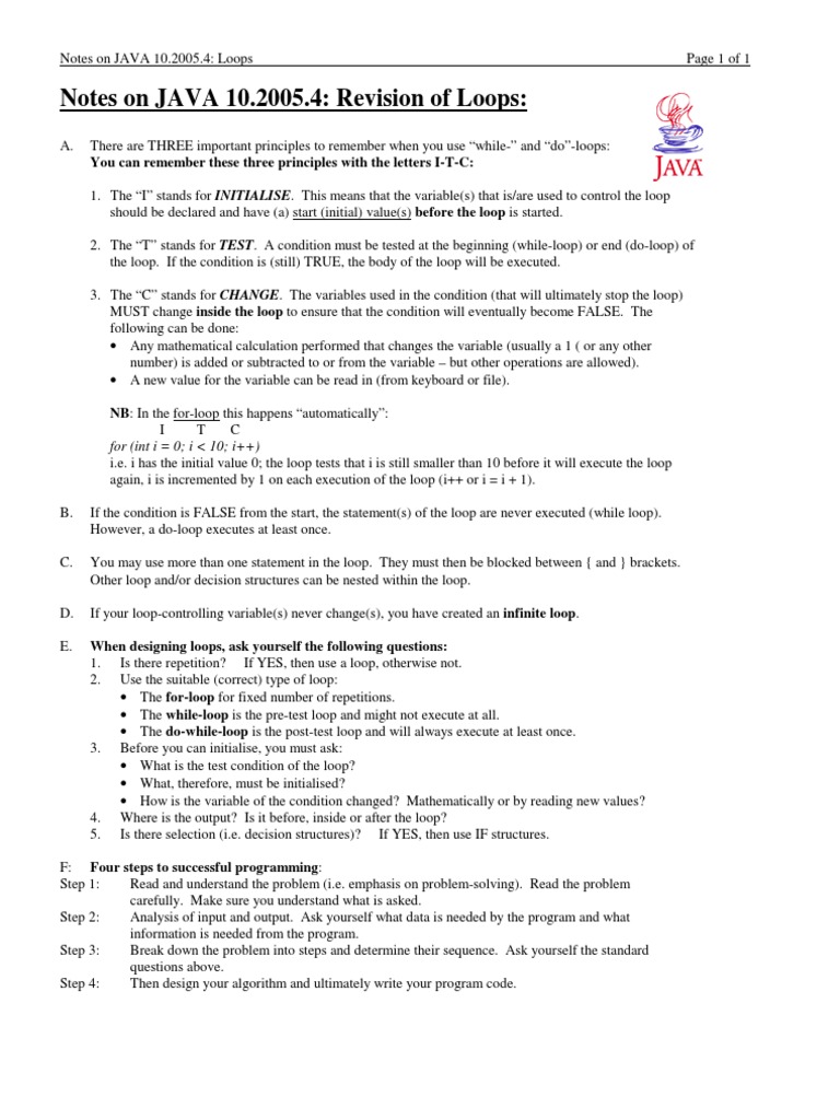 Notes on JAVA 10.2005.4: Revision of Loops: