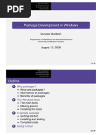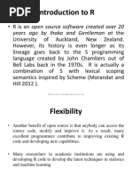 This rst example already illustrates several features of R: 1. It includes a large number of functions (here, runif to generate random numbers from the unif orm distribution; round to round them to a specied precision; and sort to sort them); 2. These functions have arguments that specify the exact behaviour of the function. For example, round has two arguments: the rst is the object to be rounded (here, the vector returned by the runif function) and the second is the number of decimal places (here, 2); 3. Many functions are vectorized: they can work on vectors (and usually matrices) as well as scalars. Here the round function is modifying the results of the runif function, which is a 12-element vector; 4. Values returned by a function can be immediately used as an argument to another function. Here the results of runif is the vector to be rounded by the round function; and these are then used by the sort function. To understand a complex expression, read it from the inside out. 5. R has a rich set of functions for simulation of random processes.