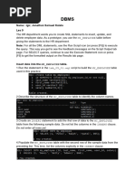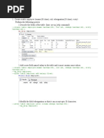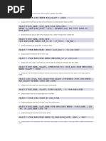 Simple join 48.List our employees with their department names 49.Display employees with their designations (jobs) 50.Display the employees with their department name and regional groups. 51.How many employees who are working in different departments and display with department name. 52.How many employees who are working in sales department. 53.Which is the department having greater than or equal to 5 employees and display the department names in ascending order. 54.How many jobs in the organization with designations. 55.How many employees working in New York. Non Equi Join: 56.Display employee details with salary grades. 57.List out the no. of employees on grade wise. 58.Display the employ salary grades and no. of employees between 2000 to 5000 range of salary. Self Join: 59.Display the employee details with their manager names. 60.Display the employee details who earn more than their managers salaries. 61.Show the no. of employees working under every manager. Outer Join: 61.Display employee details with all departments. 62.Display all employees in sales or operation departments. Set Operators: 63.List out the distinct jobs in Sales and Accounting Departments. 64.List out the ALL jobs in Sales and Accounting Departments. 65.List out the common jobs in Research and Accounting Departments in ascending order.
