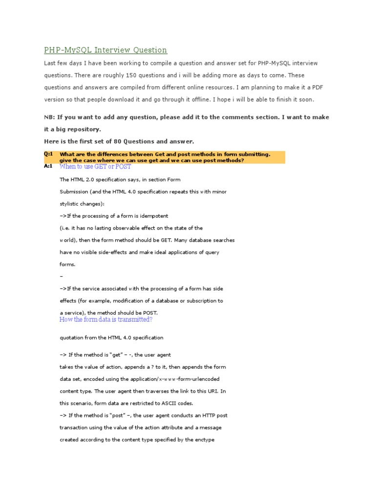 Last few days I have been working to compile a question and answer set for PHP-MySQL interview questions. There are roughly 150 questions and i will be adding more as days to come. These questions and answers are compiled from different online resources. I am planning to make it a PDF version so that people download it and go through it offline. I hope i will be able to finish it soon. NB: If you want to add any question, please add it to the comments section. I want to make it a big repository. Here is the first set of 80 Questions and answer.