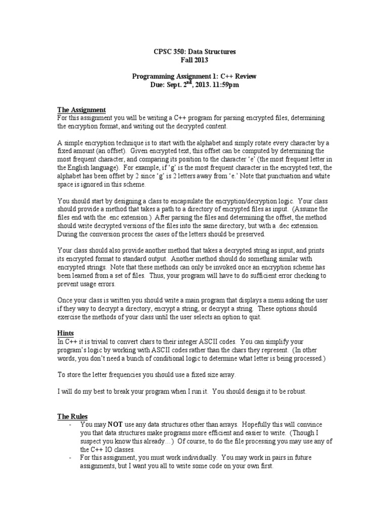 11:59pm The Assignment For this assignment you will be writing a C++ program for parsing encrypted files, determining the encryption format, and writing out the decrypted content. A simple encryption technique is to start with the alphabet and simply rotate every character by a fixed amount (an offset). Given encrypted text, this offset can be computed by determining the most frequent character, and comparing its position to the character e (the most frequent letter in the English language). For example, if g is the most frequent character in the encrypted text, the alphabet has been offset by 2 since g is 2 letters away from e. Note that punctuation and white space is ignored in this scheme. You should start by designing a class to encapsulate the encryption/decryption logic. Your class should provide a method that takes a path to a directory of encrypted files as input. (Assume the files end with the .enc extension.) After parsing the files and determining the offset, the method should write decrypted versions of the files into the same directory, but with a .dec extension. During the conversion process the cases of the letters should be preserved. Your class should also provide another method that takes a decrypted string as input, and prints its encrypted format to standard output. Another method should do something similar with encrypted strings. Note that these methods can only be invoked once an encryption scheme has been learned from a set of files. Thus, your program will have to do sufficient error checking to prevent usage errors. Once your class is written you should write a main program that displays a menu asking the user if they way to decrypt a directory, encrypt a string, or decrypt a string. These options should exercise the methods of your class until the user selects an option to quit. Hints In C++ it is trivial to convert chars to their integer ASCII codes. You can simplify your programs logic by working with ASCII codes rather than the chars they represent. (In other words, you dont need a bunch of conditional logic to determine what letter is being processed.) To store the letter frequencies you should use a fixed size array. I will do my best to break your program when I run it. You should design it to be robust. The Rules - You may NOT use any data structures other than arrays. Hopefully this will convince you that data structures make programs more efficient and easier to write. (Though I suspect you know this already) Of course, to do the file processing you may use any of the C++ IO classes. - For this assignment, you must work individually. You may work in pairs in future assignments, but I want you all to write some code on your own first.