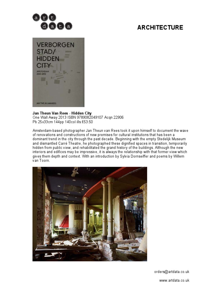 Jan Theun Van Rees - Hidden City One Wall Away 2013 ISBN 9789082049107 Acqn 22906 Pb 25x33cm 144pp 140col ills 53.50 Amsterdam-based photographer Jan Theun van Rees took it upon himself to document the wave of renovations and constructions of new premises for cultural institutions that has been a dominant trend in the city through the past decade. Beginning with the empty Stedelijk Museum and dismantled Carr Theatre, he photographed these dignified spaces in transition, temporarily hidden from public view, and rehabilitated the grand history of the buildings. Although the new interiors and edifices may be impressive, it is always the relationship with that former view which gives them depth and context. With an introduction by Sylvia Dornseiffer and poems by Willem van Toorn.