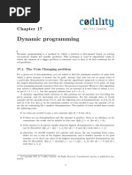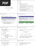Example 2 Coin Change Problem Given N amount of denominations d [N], determine the minimum amount of change required to make change for and amount A. We could use brute force and generate all possibilities however the running time for the algorithm would be exponential. Since this problem has an optimal structure and shared subproblems we will use dynamic programming. Step 1 - Define the optimal structure for the problem. In a solution to make change for A cents, we can say that for a value C and C A, we can split the optimal solution into C cents and A C cents. The solution to C cents must be optimal because if there was a way to generate change using fewer coins to make C cents we would replace that method with the better to generate C cents. This is the same for A C cents. Step 2 - Solve the problem recursively Let MC (A) be a function which returns the minimum number of coins needed to make change for A cents. As we said in the optimal structure there exists a value C which splits the amount of coins optimally between 0..C, C+1 .. A. Let C be a value of d[k]. If d[k] is the optimal value then we can say that MC (A) = 1 + MC (A d[k]).