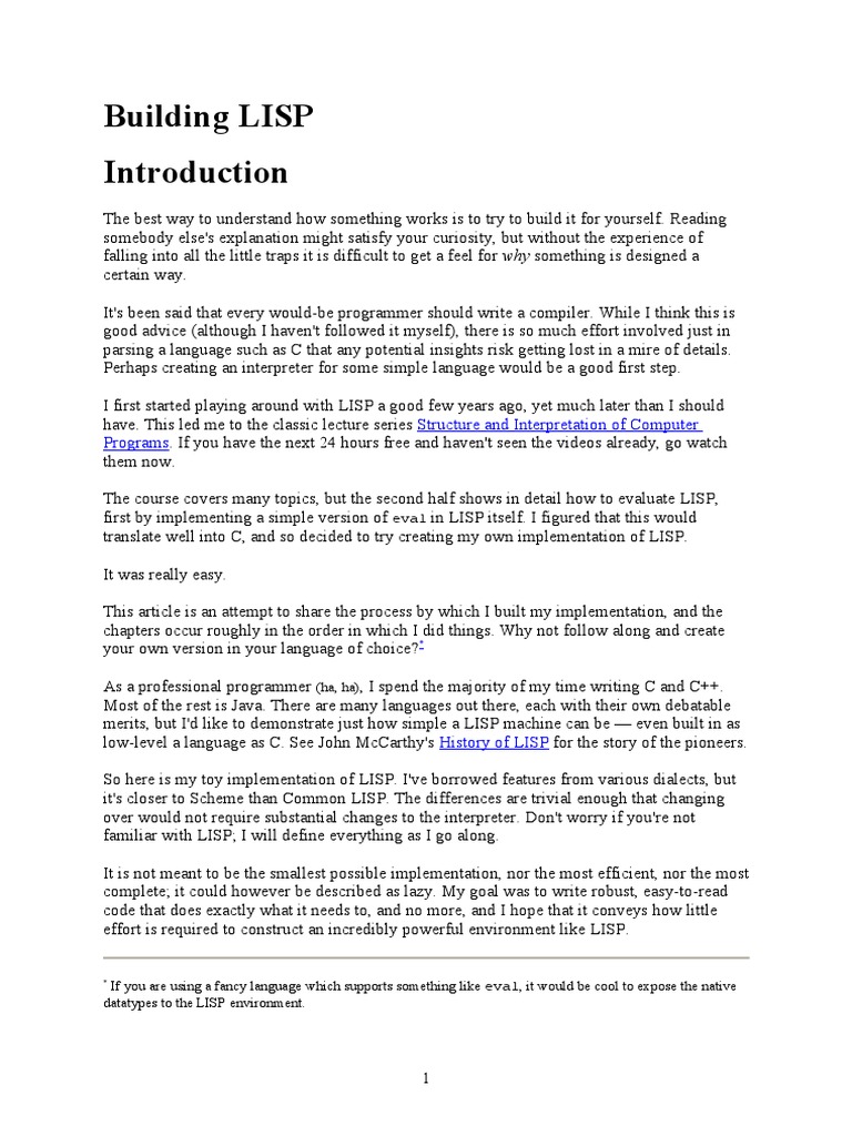 The best way to understand how something works is to try to build it for yourself. Reading somebody else's explanation might satisfy your curiosity, but without the experience of falling into all the little traps it is difficult to get a feel for why something is designed a certain way. It's been said that every would-be programmer should write a compiler. hile I think this is good advice !although I haven't followed it myself", there is so much effort involved #ust in parsing a language such as $ that any potential insights risk getting lost in a mire of details. %erhaps creating an interpreter for some simple language would be a good first step. I first started playing around with &I'% a good few years ago, yet much later than I should have. This led me to the classic lecture series 'tructure and Interpretation of $omputer %rograms. If you have the next () hours free and haven't seen the videos already, go watch them now. The course covers many topics, but the second half shows in detail how to evaluate &I'%, first by implementing a simple version of eval in &I'% itself. I figured that this would translate well into $, and so decided to try creating my own implementation of &I'%. It was really easy. This article is an attempt to share the process by which I built my implementation, and the chapters occur roughly in the order in which I did things. hy not follow along and create your own version in your language of choice*+ ,s a professional programmer !ha, ha", I spend the ma#ority of my time writing $ and $--. .ost of the rest is /ava. There are many languages out there, each with their own debatable merits, but I'd like to demonstrate #ust how simple a &I'% machine can be 0 even built in as low-level a language as $. 'ee /ohn .c$arthy's 1istory of &I'% for the story of the pioneers. 'o here is my toy implementation of &I'%. I've borrowed features from various dialects, but it's closer to 'cheme than $ommon &I'%. The differences are trivial enough that changing over would not re2uire substantial changes to the interpreter. 3on't worry if you're not familiar with &I'%4 I will define everything as I go along. It is not meant to be the smallest possible implementation, nor the most efficient, nor the most complete4 it could however be described as la5y. .y goal was to write robust, easy-to-read code that does exactly what it needs to, and no more, and I hope that it conveys how little effort is re2uired to construct an incredibly powerful environment like &I'%.