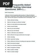 testers test this scenario. I have done this in my last two projects. Both the time, the application crashed which became a big issue. I felt proud. 42. What made you to choose testing career? Answer: I am a very detailed oriented person and I like processoriented job. The way QA process works is just the kind of work I like. For example, analyzing requirement documents, attending walkthrough meetings, writing test plans, writing test cases, executing the test cases (or running the test cases) testing the application, logging defects, retesting them and so on. I think I really like the process and thats why I chose this career. 43. When should testing start in a project? Why? Answer: We should start testing as soon as the following things are ready: -Test Data are ready -Build (all the developers have coded their code and merged them together) -Test Environment (servers, network etc) is set up and ready -When the manager asks us to go ahead and start testing. 44. Let us say you have a web application to test. How do you go about testing it? What is the process? Answer: First of all, I will look at the requirement documents (or design document in some companies). The requirement document will tell us what the functionalities in the application (software) are. Once I analyze the requirement documents (one module=one requirement document). After that, I will write test plans for each module (one module =one test plan). Then after the test plan is complete, I will write test cases (One module can have hundreds, even thousands test cases). Once the test cases are ready and the application is ready (or once the build is ready), then I will start testing. Before I start testing, however, I will make sure the test environments, test data and defect logging tools are in place. This is how I will go about testing an application.