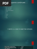 { int var1, var2; cout<<"Enter value for first integer: "; cin>>var1; cout<<"Enter value for second integer: "; cin>>var2; cout<<" Values Before swapping: "<<endl; cout<<"First Integer ="<<var1<<endl; cout<<"Second Interger ="<<var2<<endl; var1=var1+var2; var2=var1-var2; var1=var1-var2; cout<<" Values After swapping: "<<endl; cout<<"First Integer ="<<var1<<endl; cout<<"Second Interger ="<<var2<<endl; return 0; } Find last prime number occur before enter number #include<iostream> using namespace std; int main() { int num,count=0; cout<<"Enter number to find last prime number occurs before it: "; cin>>num; for( int a=num-1;a>=1;a--) { for(int b=2;b<a;b++) { if(a%b==0) count++; } if(count==0) { if(a==1) { cout<<"no prime number less than 2"; break; } cout<<a<<" is the last prime number before entered number"; break;