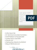you can manage snapshots or modify AWR settings. o To manage snapshots, click the link next to Snapshot s or Preserved Snapshot Set s. On the Snapshot s or Preserved Snapshot Set s pages, you can: + View information about snapshots or preserved snapshot sets (baselines). + Perform a variety of tasks through the pull-down Act ions menu, including creating additional snapshots, preserved snapshot sets from an existing range of snapshots, or an ADDM task to perform analysis on a range of snapshots or a set of preserved snapshots. o To modify AWR settings, click the Edit button. On the Edit Set t ings page, you can set the Snapshot Ret ent ion period and Snapshot Collect ion interval. Most inf ormat ive sect ions of t he report I find the following sections most useful: - Summary - Top 5 timed events - Top SQL (by elapsed time, by gets, sometimes by reads) When viewing AWR report, always check corresponding ADDM report for actionable recommendations. ADDM is a self diagnostic engine designed from the experience of Oracles best tuning experts. Analyzes AWR data automatically after an AWR snapshot. Makes specific performance recommendations. Both the snapshot frequency and retention time can be modified by the user. To see the present settings, you could use:
