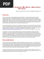 by setting the instance parameter DB_FILE_MULTIBLOCK_READ_COUNT so that: DB_BLOCK_SIZE x DB_FILE_MULTIBLOCK_READ_COUNT = max_io_size of system Query tuning should be used to optimize online SQL to use indexes. 2. DB File Sequential Read. Is the wait that comes from the physical side of the database. It related to memory starvation and non selective index use. Sequential read is an index read followed by table read because it is doing index lookups which tells exactly which block to go to. This could indicate poor joining order of tables or un-selective indexes in your SQL or wait ing f or writ es t o TEMP space (direct loads, Parallel DML (PDML) such as parallel updates. It could mean that a lot of index reads/scans are going on. Depending on the problem it may help to tune PGA_AGGREGATE_TARGET and/or DB_CACHE_SIZE. The sequential read event identifies Oracle reading blocks sequentially, i.e. one after each other. It is normal for this number to be large for a high-transaction, well-tuned system, but it can indicate problems in some circumstances. You should correlate this wait statistic with other known issues within the report, such as inefficient SQL. Check to ensure that index scans are necessary, and check join orders for multiple table joins. The DB_CACHE_SIZE will also be a determining factor in how often these waits show up. Problematic hash-area joins should show up in the PGA memory, but they're also memory hogs that could cause high wait numbers for sequential reads. They can also show up as direct path read/write waits. These circumstances are usually interrelated. When they occur in conjunction with the appearance of the 'db file scattered read' and 'db file sequential read' in the Top 5 Wait Events section, first you should examine the SQL Ordered by Physical Reads section of the report, to see if it might be helpful to tune the statements with the highest resource usage. It could be because the indexes are fragmented. If that is the case, rebuilding the index will compact it and will produce to visit less blocks. Then, to determine whether there is a potential I/O bottleneck, examine the OS I/O statistics for corresponding symptoms. Also look at the average time per read in the Tablespace and File I/O sections of the report. If many I/O-related events appear high in the Wait Events list, reexamine the host hardware for disk bottlenecks and check the host-hardware statistics for indications that a disk reconfiguration may be of benefit. Block reads are fairly inevitable so the aim should be to minimize unnecessary I/O. I/O for sequential reads can be reduced by tuning SQL calls that result in full table scans and using the partitioning option for large tables. 3. Free Buffer Waits. When a session needs a free buffer and cannot find one, it will post the database writer process asking it to flush dirty blocks (No place to put a new block). Waits in this category may indicate that you need to increase t he DB_BUFFER_CACHE, if all your SQL is tuned. Free buffer waits could also indicate that unselective SQL is causing data to flood the buffer cache with index blocks, leaving none for this particular statement that is waiting for the system to process. This normally indicates that there is a substantial amount of DML (insert/update/delete) being done and that the Database Writer (DBWR) is not writing quickly enough; the buffer cache could be full of multiple versions of the same buffer, causing great inefficiency. To address this, you may want to consider accelerat ing increment al checkpoint ing, using more DBWR processes, or increasing the number of physical disks. To investigate if this is an I/O problem, look at the report I/O Statistics. Increase the DB_CACHE_SIZE; shorten the checkpoint; tune the code to get less dirty blocks, faster I/O, use multiple DBWRs.