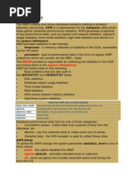 - SQL Ordered by Parse Calls: These SQLs experienced a high number of reparsing operations. - SQL Ordered by Sharable Memory: Includes SQL statements cursors which consumed a large amount of SGA shared pool memory. - SQL Ordered by Version Count: These SQLs have a large number of versions in shared pool for some reason. - Complete List of SQL Text: Instance Activity Stats This section contains statistical information describing how the database operated during the snapshot period. - Instance Activity Stats - Absolute Values: This section contains statistics that have absolute values not derived from end and start snapshots. - Instance Activity Stats - Thread Activity: This report section reports a log switch activity statistic. I/O Stats Section This section shows the all important I/O activity for the instance and shows I/O activity by tablespace, data file, and includes buffer pool statistics. - Tablespace IO Stats - File IO Stats Buffer Pool Statistics Section Advisory Statistics Section This section show details of the advisories for the buffer, shared pool, PGA and Java pool. - Instance Recovery Stats: - Buffer Pool Advisory: - PGA Aggr Summary: PGA Aggr Target Stats; PGA Aggr Target Histogram; and PGA Memory Advisory. - Shared Pool Advisory: - SGA Target Advisory - Stream Spool Advisory - Java Pool Advisory Wait St at ist ics Sect ion - Buffer Wait Statistics: This important section shows buffer cache waits statistics. - Enqueue Activity: This important section shows how enqueue operates in the database. Enqueues are special internal structures which provide concurrent access to various database resources. Undo Statistics Section - Undo Segment Summary: This section gives a summary about how undo segments are used by the database. - Undo Segment Stats: This section shows detailed history information about undo segment activity. Latch Statistics Section: This section shows details about latch statistics. Latches are a lightweight serialization mechanism that is used to single-thread access to