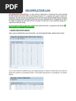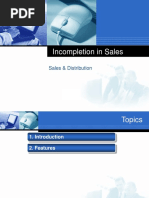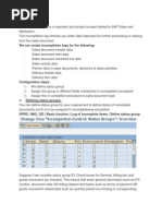 An incompletion procedure groups the fields together that must be checked for completion. If any of the fields are blank, the document is incomplete. Incompletion procedures can be assigned and maintained at various levels and for various document types: Sales header (different procedures can be assigned to different document types) Sales item (item categories can contain different procedures) Schedule line (each can contain different procedures) Partners (can maintain different procedures for each partner function) Sales activity Delivery header Delivery item