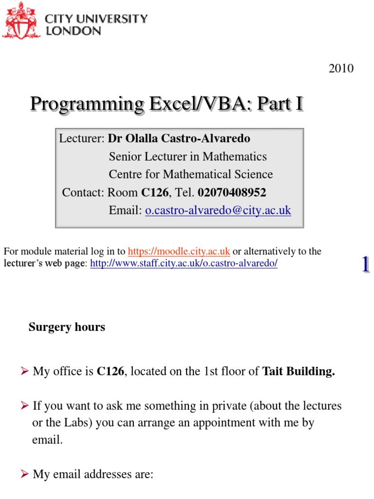 Reading list The lecture notes for this module are partly based on several text books which can be useful for different parts of the module. The lecture notes and your class notes should be sufficient for you to understand every aspect of the module. If you have used Excel before, you will find the first few weeks of lectures very easy (it will get harder!) The following text books will be helpful for different parts of the module. Some books concentrate only on Excel, others cover only VBA. They are also of different levels. Copies of all these books are available in our library.