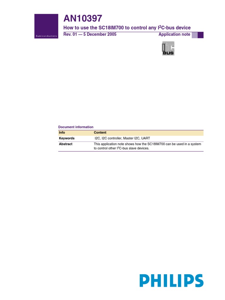 Document information Info Keywords Abstract Content I2C, I2C controller, Master I2C, UART This application note shows how the SC18IM700 can be used in a system to control other I2C-bus slave devices.