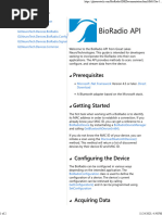 Name BioRadio Data GoodPackets BadPackets DroppedPackets Sample Rate Type 2d array of Double-Prec. Floating-Point Unsigned Long Integer Unsigned Long Integer Unsigned Long Integer Double-Prec. Floating-Point Description Data acquired; each row of the array representing an input channel, each column with one data point. Number of valid packets transferred since Start Number of invalid packets transferred since Start Number of missed packets transferred since Start Samples/second defined by the currently loaded configuration